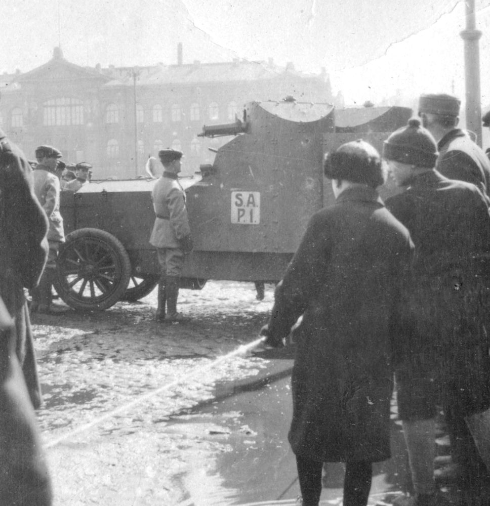 in front of tram depot main building in downtown Helsinki in April of 1919. One of the armoured cars