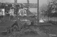 antitank-rifle L-39 photographed in front of burning building. Soldier in the foreground has captured