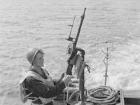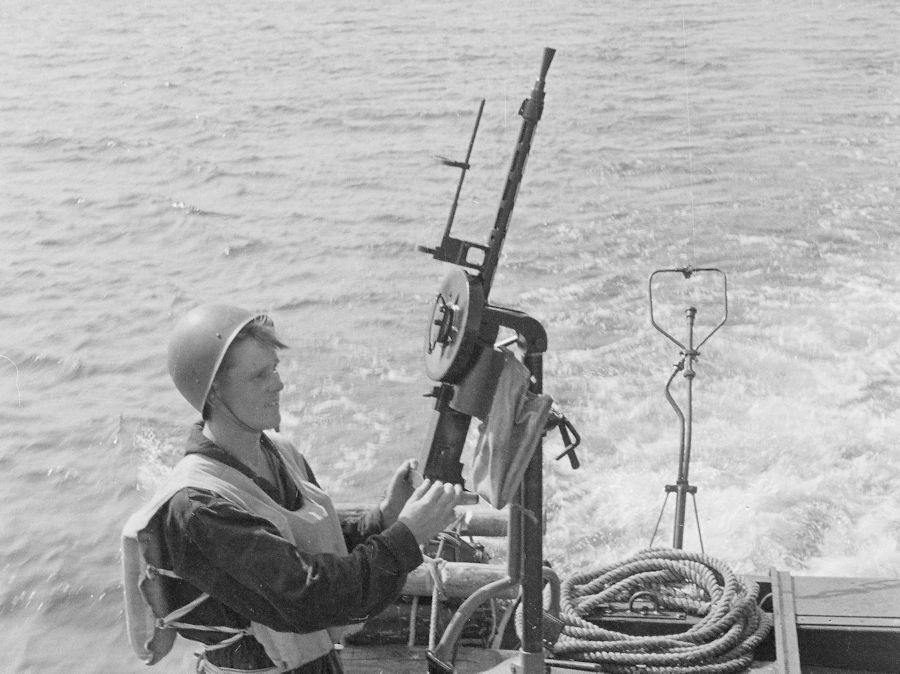 machinegun on Finnish Navy patrol boat VMV 5 (Vartiomoottorivene 5). Sailor acting as machine gunner is
