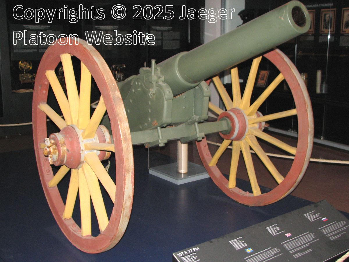 These were the smallest caliber cannons acquired by Imperial Russia in 1870's. The gun had two versions - normal field gun version (87 K/77) and cavalry gun version (87 K/77-R). Both versions had naturally been designed as horse-towed, but cavalry version had been intended to be more mobile with reduced weight. This reduction of weight happened by equipping cavalry version with shorter barrel and by leaving off details like seats for the crew from top of the gun. The gun had box trail and the usual wooden wheels equipped with steel hoops. Early on German firm Krupp manufactured the gun for Russian military, but later on Russian Obuhov factory became the main manufacturer. There were clear differences between the Obuhov made and Krupp manufactured versions. There were also two types of breech systems used in these guns: The large majority (the ones made in year 1893 or later) had de Bange type screw breech, while first batch of the Krupp made guns had Krupp horizontal sliding block breech (model 1873). Also two variations of elevation screw system existed and even gun barrels used by Obuhov and Krupp were structurally different: Krupp barrels had only one layer and their back part inside casing, while Obuhov barrels had two layers inside each other for the whole length of barrel. Some of the guns had gun shields, but most did not. During World War 1 these guns were no longer among the best ones that the Russians had, but were still considered good enough for non-frontline use. Year 1918 large number of the guns had been positioned in fortifications, which the Russians had built in Finland for possible German attack.