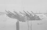 PICTURE: Eight 152 K/77-120p field guns among snow drifts in railway station of Vuoksenniska (city of Imatra). Photo crop.