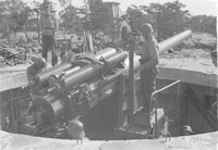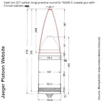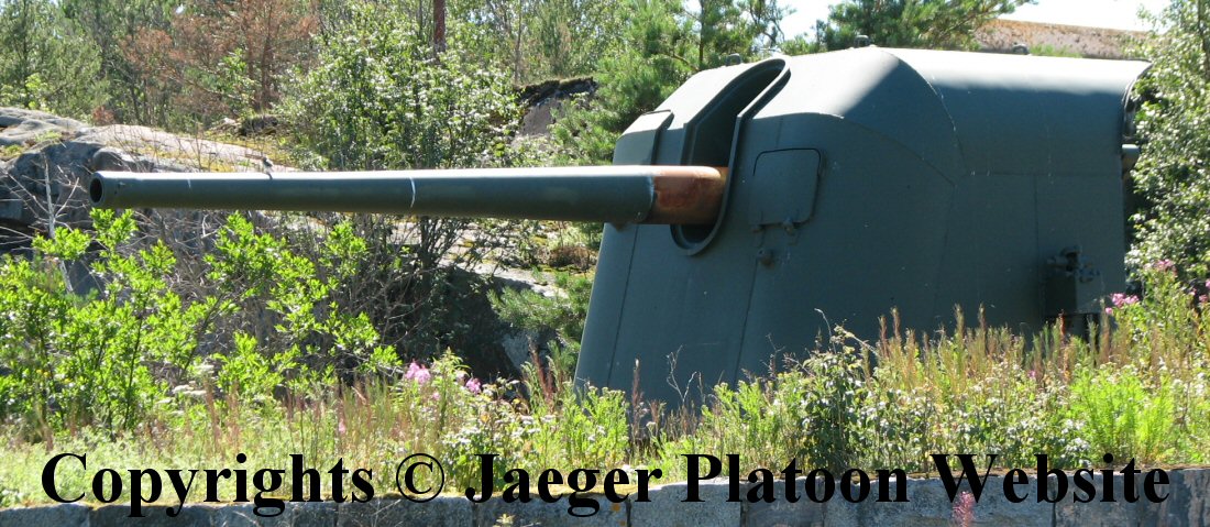 152/22 D "Jumbo" (152 mm naval gun with 22 caliber barrel, model Durlacher): This gun was essentially coastal gun version of Russian 152 K/77-190p siege gun. Apparently about 80 - 90 of these guns fell to Finnish hands in year 1918, but they did not see any combat use with Finnish military. They had still seen extensive use with Russian coastal artillery during World War 1 and apparently some may have still seen some use with the Soviets even during World War 2. The guns used in Finland had been equipped with gun mount designed by General R.A. Durlacher, which used during recoil used weight of the gun to dampen the recoil, since when the gun slide rearwards during recoil it was forced to climb higher on the gun carriage. Horizontally laying the gun was quite slow and problematic, since the gun mount was rotated on top steel rail by attaching a chain to most suitable one of the numerous bolts and pulling the chain with wheel. In 1940s Finnish military experimented with notably faster and easier to use horizontal gun laying system that was designed locally and installed to one of the guns of Kuuskajaskari Coastal Fort, but since the whole gun was so outdated (low rate of fire and limited maximum range), it was decided that while successful introducing the modification to larger number of guns would have been waste of resources. Finnish soldiers gave this gun nickname "Jumbo" probably due to its large weight, which besides being so outdated gun design, effectively limited interest of Finnish military. Otherwise the gun was structurally simple and strong design, but also by that time their breach systems were also worn out and become so loose fitting that when fired, in addition of muzzle flash it was normal for in addition of muzzle flash for another flash to originate from the screw breech. In 1920's and 1930's Helsinki Civil Guard Coastal Artillery Division / Helsinki Coastal Artillery Civil Guard actively used 152/22 D artillery battery on Pikku-Mustasaari Island for its training purposes.