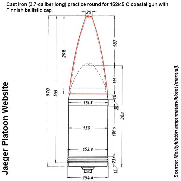 (*) Separately loaded ammunition. Finnish coastal artillery used these guns with same cartridge cases as 152/45 C coastal gun.