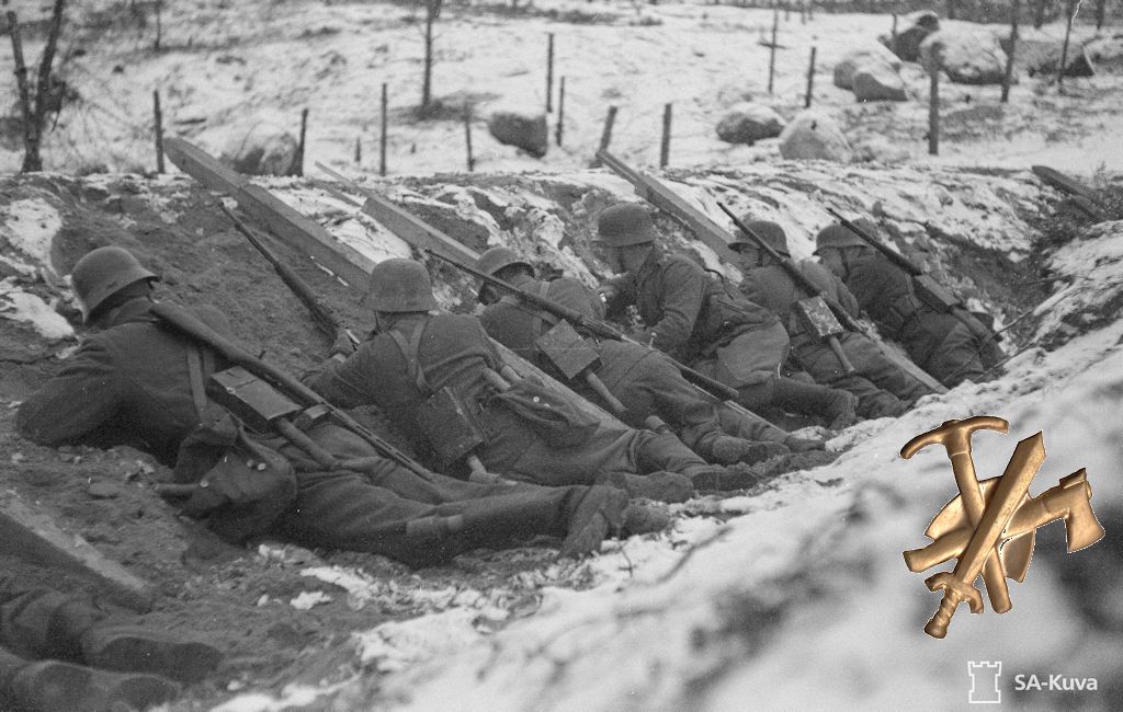 PICTURE: Combat engineer unit of Finnish Army in training. Soldiers are equipped with sections of bangalore torpedo, satchel charges and stick hand grenades. First soldier from the left has Suomi M/31 submachine gun with 50-round box magazine. Photographed by Öhrnberg in Hanko / Hango / Gangut Peninsula in October of 1942. Lower right corner of the photograph has uniform insignia of Finnish Engineer Corps. (SA-kuva.fi photo archive, photograph number 114608).