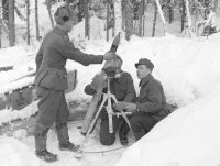 PICTURE: Finnish period photo showing 81 Krh/26 mortar. The pouch on top of base plate is presumably for mortar director (sight system).(Photo part of Jaeger Platoon Website photo collection). CLICK THUMBNAIL TO SEE LARGER PIC (146 KB).