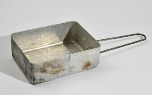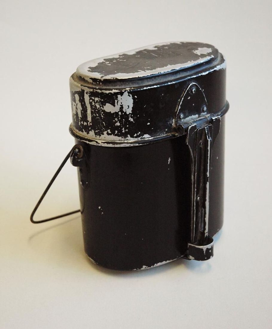 Mess tin (kenttäkeittoastia / kenttäpakki / pakki): Probably the first mess tin design resembling what was later adopted as standard issue Finnish mess tin was Swiss mess tin, whose sheet steel version was introduced in year 1875 and its notably lighter aluminium version in year 1882. German Army introduced its own all aluminium structure mess tin Essgeschirr model 1908 based on Swiss model 1882 in year 1908, but decided to replace mess tin's aluminium handle with one made from galvanised iron only two years later with this improved version being referred as model 1910. Pre year 1914 version had the handle as separate part, but apparently due to it being often misplaced by soldiers, in version of mess tin introduced year 1914 the handle was permanently attached to lid (pan) of the mess tin. During World War 1 Germany issued two notable sub-variants of model 1910 - M.1914 manufactured from aluminium and M.1915 made often from steel with interior enamel finish and outside surfaces painted grey. German mess tin model 1910 had internal capacity of about 2 litres and in German use it was later replaced with mess tin M.31, which became standard German mess tin of World War 2.