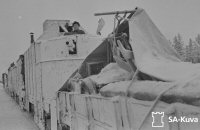 Headquarters 4th Army Corps had requested armoured train as its support. How important they considered getting armoured train shows the fact that when their reply had not been answered promptly they had already started building armoured train of their own. However this armoured train project of 4th Army Corps did not have to continue long. 23rd of January Armoured Train 2 was sent as their support to Ladoga Carelia (area northeast of Lake Laatokka / Ladoga). For these battles the train was named with codename "Armas" (fairly common Finnish first name for males, which also translates as "beloved"). While in Ladoga Karelia the train mostly operated in Kitilä - Impilahti railway section, where its main function was shelling Kitilä motti (pocket) with its mountain guns when needed. However the train had to avoid return fire of Soviet heavy weapons in this motti its attacks tended to be brief. First operation that Armoured Train 2 took part in this area was fire support mission for 2nd Battalion of Infantry Regiment 35 it accomplished the same day that it arrived this area (23rd of January). This first operation was the typical "fire-strike" mission - the train moved to no-mans land where it shelled and machinegun the enemy for a while before heading back. However the first operation came very close becoming to disaster - while the train was in no-mans land Soviet artillery damaged tracks on opening of Kitilä village behind it. With the damaged tracks behind it the armoured train was without route of retreat and stuck in the no-mans land. It had no choice than stay there until the repairs locomotive and rail repair crew arrived the next night and fixed the damaged tracks.