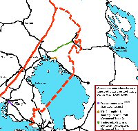 PICTURE: Map showing the railway sections where Finnish Armoured Trains mostly operated during Winter War. CLICK THUMBNAIL TO SEE LARGER PIC (144 KB).