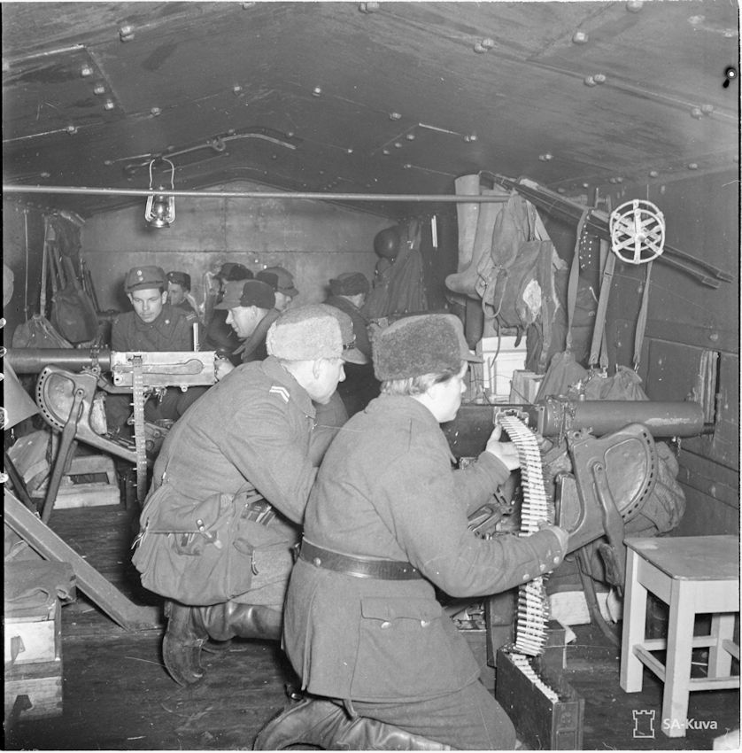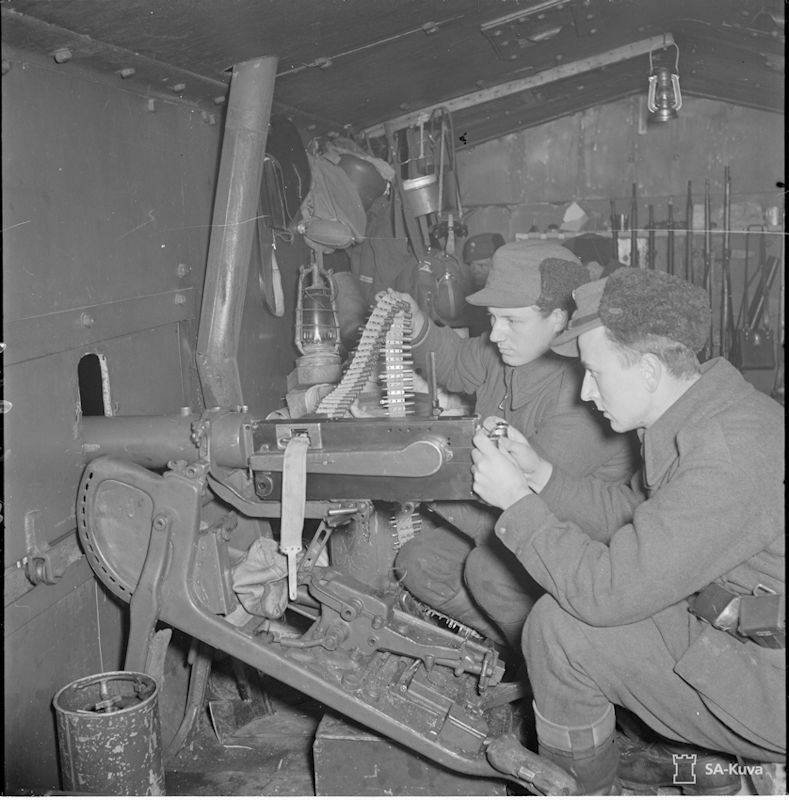 PICTURE: Photographs taken inside armoured trains are rare to find. This photograph taken during Winter War provides rare peak into machine gun wagon of Finnish World War 2 era armoured train. Machine guns appear to be Maxim M/09, but the mounts used with them are schlittenlafette 08 originally issued with German Maxim M/08.Soldiers are wearing field uniforms M/27 with fur caps M/27. (SA-kuva photo archive, photograph number 2241). CLICK THUMBNAIL TO SEE LARGER PIC (140 KB).