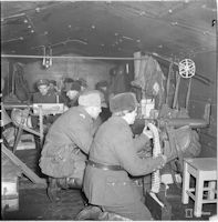 PICTURE: Another indoor photograph taken inside machine gun wagon of Finnish armoured train during Winter War. Machine guns appear to be Maxim M/09, but the mounts used with them are schlittenlafette 08 originally issued with German Maxim M/08. Soldiers are wearing field uniforms M/27 with fur caps M/27. (SA-kuva photo archive, photograph number 2242). CLICK THUMBNAIL TO SEE LARGER PIC (113 KB).