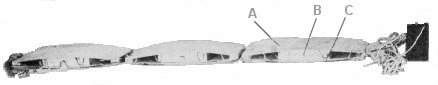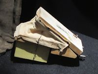 PICTURE: Picture of slide mine as used in Winter War. Structure: A- piece of plywood, B- explosive charge and C- metal clippings. The battery with wire is visible on the right. (photo source: "Miinat ja ansat"-article).