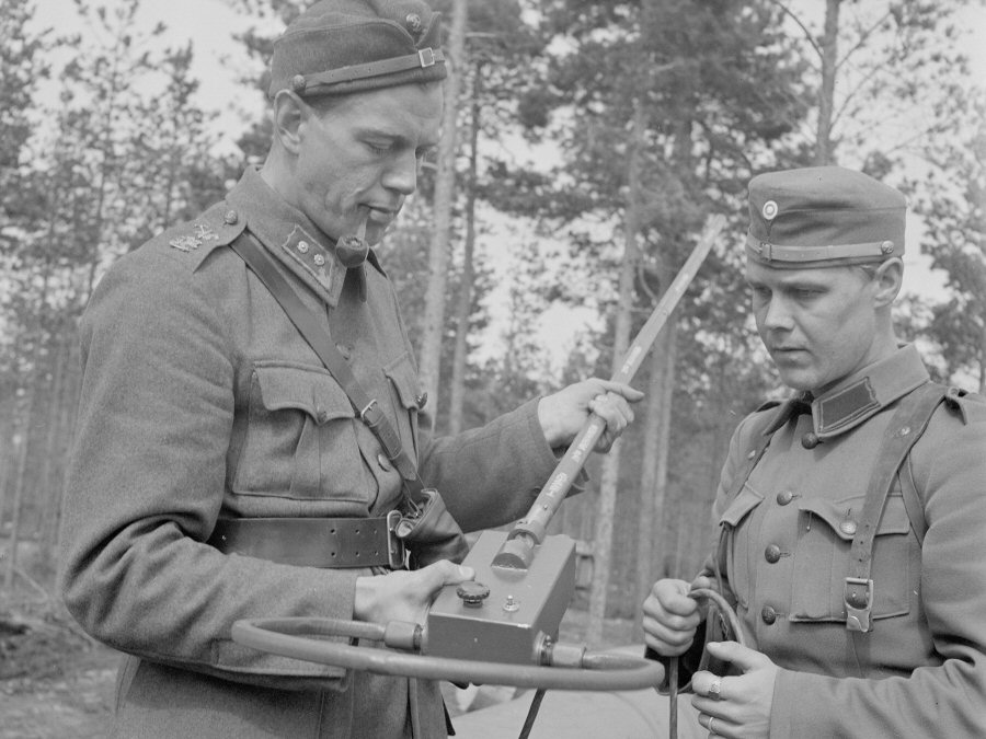 PICTURE: Sapper Lieutenant photographed inspecting mine detector m/41 (miinaharava m/41)