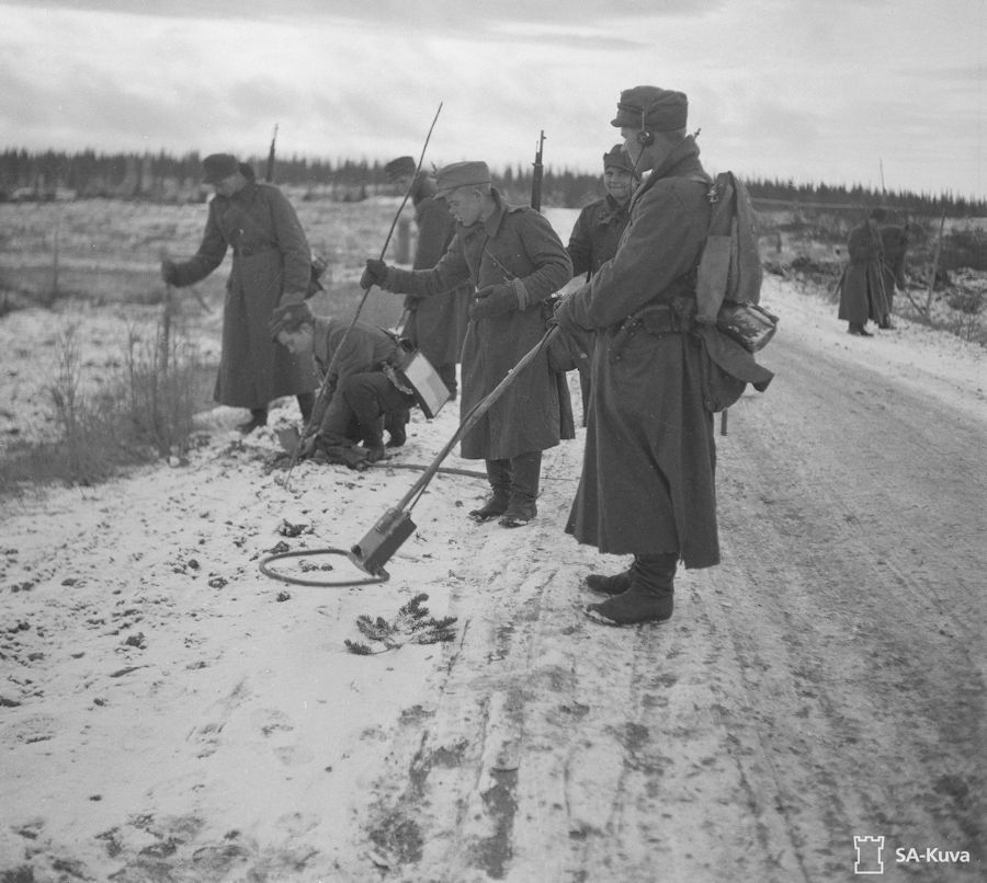 PICTURE: Finnish soldiers with mine-detector m/41 and prods are searching landmines