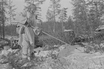 shows Finnish soldier with minedetector of unknown model in Regiment's motti (pocket) of Lemetti in January