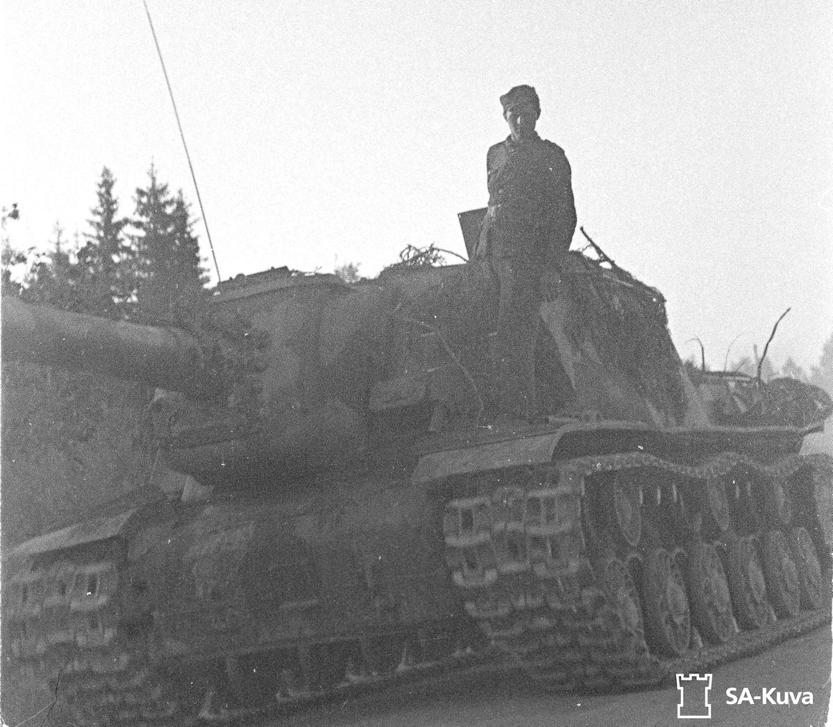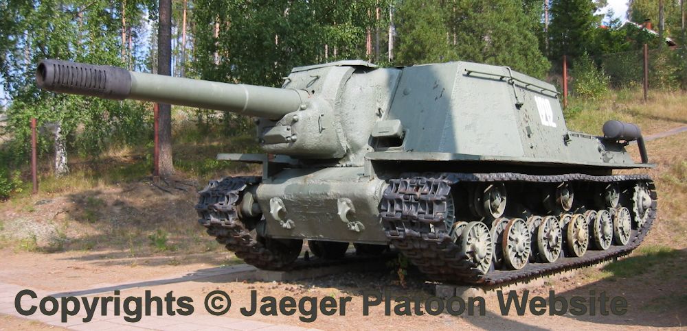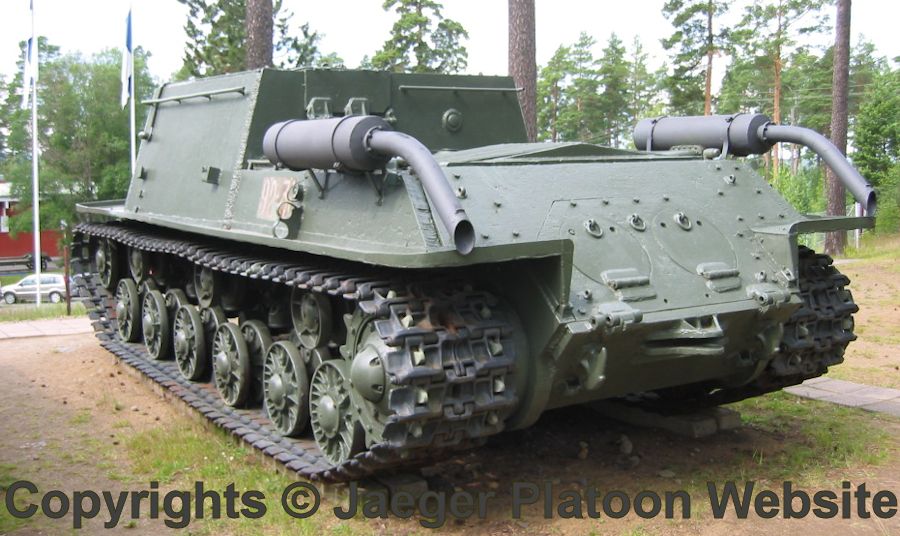 Finnish Army knew this assault gun as JSU 152 and captured two of them during World War 2. Both of these were captured 25th of June 1944 near Portinhoikka crossroads during battles of Tali-Ihantala. One of the captured two vehicles was captured basically intact, even if abandoned by its crew. It was captured about 700 meters from Portinhoikka crossroads on road leading to Juustila. Taken immediately to Finnish use, it was quickly repainted with Finnish insignia and lost in battle just four days later near Kölni farm in near Portinhoikka in 29th of June. That day it was sent to counter-attack with mixed four man crew gathered for the last minute – driver (Private Virtanen) had earlier served as driver of KV-1 and had some time to study the assault gun, but other three crewmembers were picked for the job just half-an-hour before launching the counter-attack and had earlier served in T-28 medium tank. JSU 152 was leading Finnish counter-attack from Portinhoikka crossroads on a city leading towards city of Viipuri when it found itself fighting two T-34/85 tanks. Captured JSU 152 fired at them, but missed its target. And then both Soviet T-34/85 tanks hit front hull of JSU 152, made its mixed crew to bail out and abandon the vehicle. Later Soviet-taken photographs indicate that this was probably a smart move, since the photos show signs of follow-up shots causing large explosion that destroyed the abandoned assault gun.