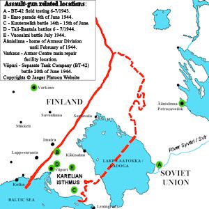 In June – July 1943 1st Company of Assault Gun Battalion was sent to frontline in River Syväri / Svir to field-test BT-42 assault gun and its howitzer. The assault guns used by 1st Company for this were R-704, R-708, R-710, R-713 and R-717. This field-test was such that BT-42 assault guns were used to destroy targets such as machinegun nests and bunkers located on other side of the river – mostly with direct fire, but also indirect fire was occasionally used. While this field-testing was apparently quite limited, with the assault guns firing from prepared positions and did not fit to much more versatile role reserved by German military for assault guns, as a whole the operation was a success. With 1,279 howitzer shells fired BT-42 assault guns succeeded destroying about hundred targets and damaging equal number. One soldier was killed by return fire and another wounded. All assault guns involved survived this first battle of theirs, with only R-710 being damaged by enemy fire and even its damages were slight. Also technical issues proved to be surprisingly small – just one engine failure and some issues with suspension and locking system.
