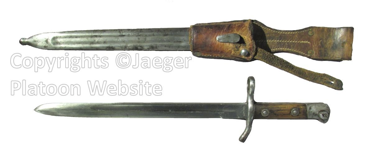Swedish infantry rifles m/96 were issued with all-around good handy all-steel dagger-shaped knife bayonet m/96, which may well been the most successful of the bayonets that got acquired with rifles to Finnish use during World War 2. Swedish knife-bayonet m/96 made a good bayonet, relatively useful utility knife and was also quite well suited for role of a combat knife – and hence seems to have been at least somewhat popular with the troops issued with the rifle. Italian "Terni-rifle" (7,35 mm fucile corto modello 38) was issued in Finland with Italian-manufactured folding knife-bayonet m/38, which apparently may have been more popular among Finnish soldiers than the rifles that they came with. While the Italian folding knife bayonet m/38 was pretty horrible as a bayonet, apparently it had been originally designed to be carried attached to "Terni-rifle" folded open or closed, but could be also carried in scabbard while folded open. It seems that most of the scabbards issued with Italian bayonet m/38 were equipped with Italian made grey leather frogs, while some had steel belt loops. This bayonet was not much a fighting knife either, but when needed could serve as a half-decent utility knife. Both Swedish m/96 and Italian m/38 were acquired in year 1940 and remained in use of Finnish home front troops and certain other military units (sappers, coastal artillery, anti-aircraft units, signal corps etc) until end of World War 2. Those bayonets issued to Field Army got gathered off from troops circa 1942 - 1943 along all other Finnish-issued bayonets and stored for rest of the war.