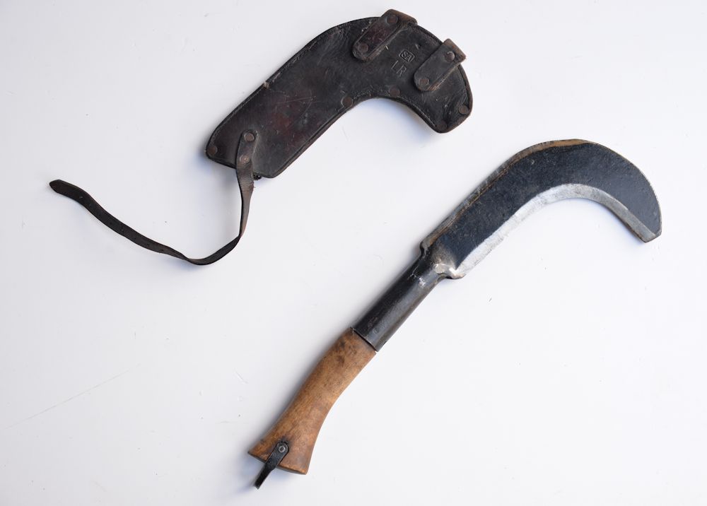 PICTURE: Billhook (vesuri) of Finnish Army with its scabbard. The leather scabbard allows billhook to be carried in belt. CLICK THUMBNAIL TO SEE LARGER PIC (59 KB).