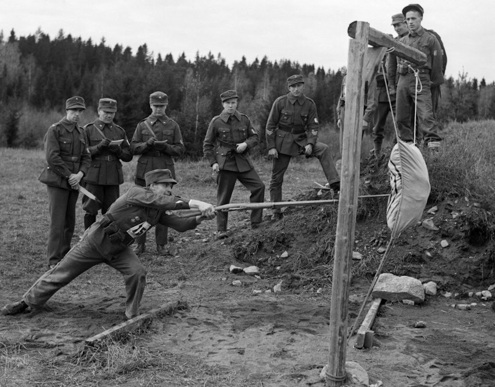 PICTURE: Photograph showing one of the bayonet moves of Finnish military, referred in manuals as long thrust, being performed in military competitions of Civil Guard in year 1938. What is known suggests that long thrust was a bayonet move loaned from World War 1 era German bayonet fighting doctrine. The rifle appears to be likely infantry rifle m/91 with its standard socket bayonet m/91. (Photo source Vapriikin Kuva-arkisto / Photo Archive of Museum Centre Vapriikki / Museokeskus Vapriikki, used with CC BY 2.0 license). CLICK THUMBNAIL TO SEE LARGER PIC (190 KB).