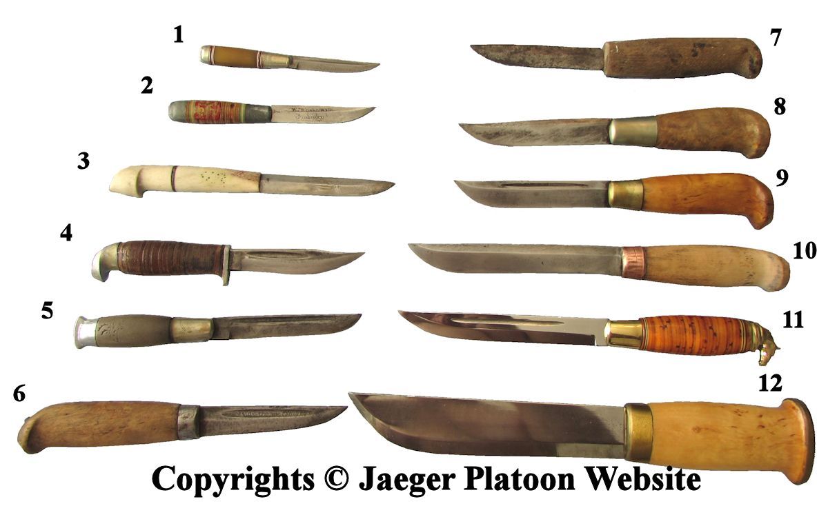 As mentioned originally in year 1918 this dagger was intended as dress uniform item for all non-commissioned officers and enlisted men, while officers with riding horse were to have cavalry officer’s swords for the same purpose and other officers were to be equipped with Laplander puukko-knife, which apparently was never really adopted. New uniform regulations introduced in year 1919 also had veitsi-pistin (knife-bayonet) for non-commissioned officers and enlisted men for dress uniform sort of use, but also a longer version of the dagger was introduced for officers serving in function without a riding horse. This longer officer's version has its black steel scabbard equipped with two steel rings, because they were to carry the dagger with sword hanger, but the version was replaced with officer's (dress sword) already in regulations of year 1922 and is nowadays very rare item. Year 1930 uniform regulations introduced senior NCO ranks (from Vääpeli to Sotilasmestari) (dress) sword design of their own - aliupseerinmiekka (non-commissioned officer's sword) - after this the dagger was only to be used by junior NCO ranks (from Alikersantti to Ylikersantti), reserve officer trainees and enlisted men. However since the senior NCO ranks were allowed to use the dagger instead of non-commissioned officer’s sword during transition period of non-specified length, in some cases senior non-commissioned officers continued to use the dagger for a very long time. As noted also rank-and-file soldiers were allowed to buy the dagger on their own expense and wear it with their holiday uniform, this seems to have been quite rare early on but in 1930’s its role evolved towards dress dagger carried by normal rank-and-file soldiers. With Europe plummeting to World War 2 manufacturing of puukko-pistin m/19 seem to have ended circa 1939 - 1940 and their use ended to World War 2. Apparently at least some Finnish soldiers took their puukko-pistin m/19 daggers to war, which is not a large surprise considering how well suited the dagger itself seems to be used as a combat knife. On the other hand dagger's steel scabbard, in which the dagger easily rattles during movement, was far less suited for that purpose. According old proverb "imitation is the most sincere form of flattery". What is known apparently Soviet NKVD "Finka" combat knife was directly based to Finnish puukko-pistin m/19 dagger. In addition there seem to have been some puukko-knife designs, which loaned features from this Finnish dagger and were introduced to Finnish market in 1930's.