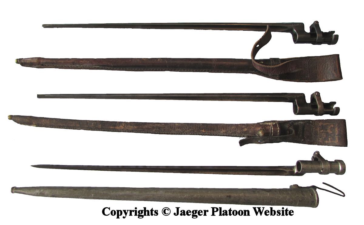 PICTURE: Socket bayonets m/91 with their scabbards. The tin scabbard was made in Germany during World War 1, while the leather scabbards are usually Finnish-made. There were/are several variations of the leather scabbards. COPYRIGHTS JAEGER PLATOON WEBSITE. CLICK THUMBNAIL TO SEE LARGER PIC (102 KB).
