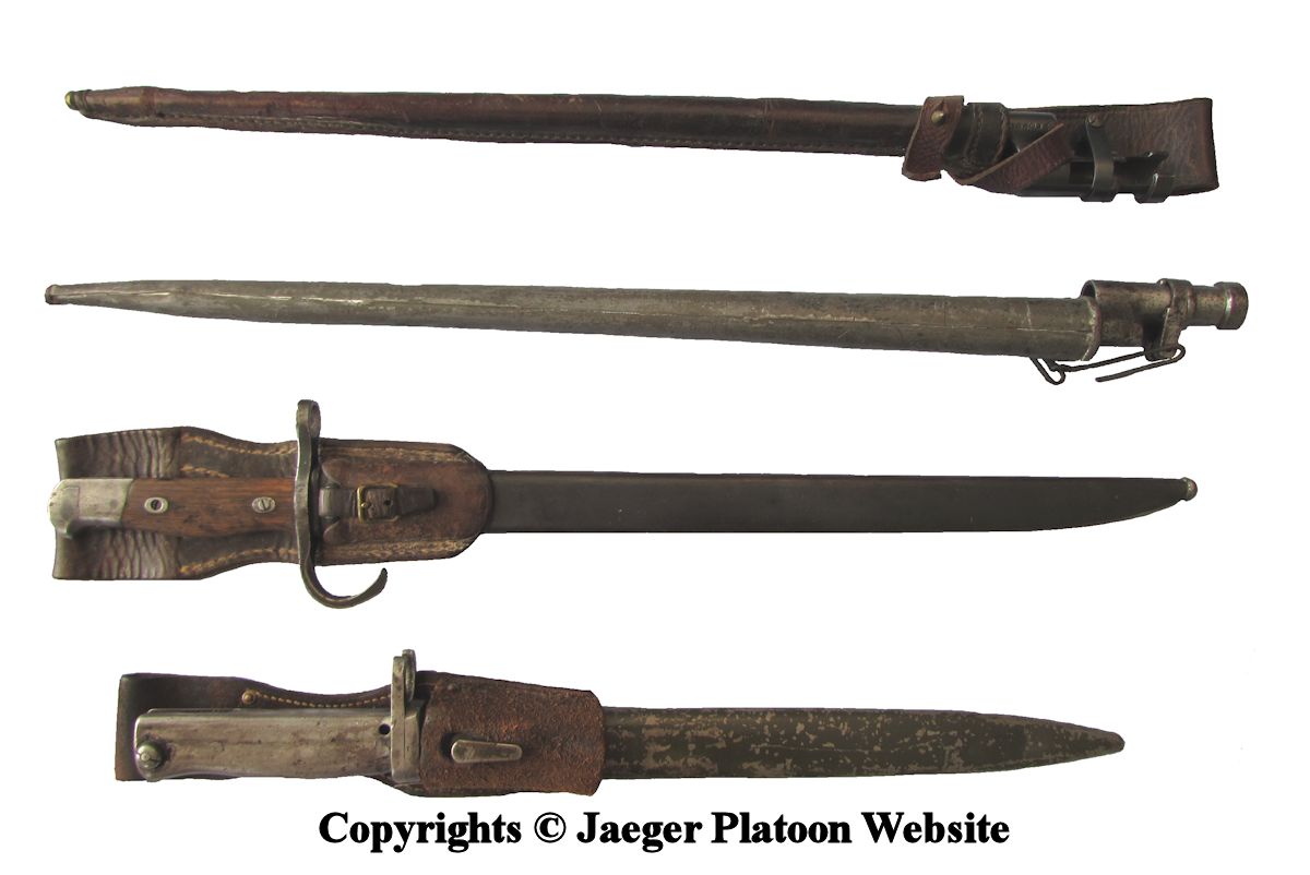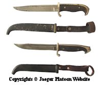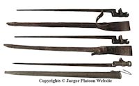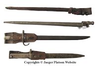 PICTURE: From the top: Two socket-bayonets m/91 in their scabbards, Japanese knife bayonet for Japanese rifles and German ersatz bayonet issued commonly with Mosin-Nagant m/91 rifles. COPYRIGHTS JAEGER PLATOON WEBSITE. CLICK THUMBNAIL TO SEE LARGER PIC (97 KB).