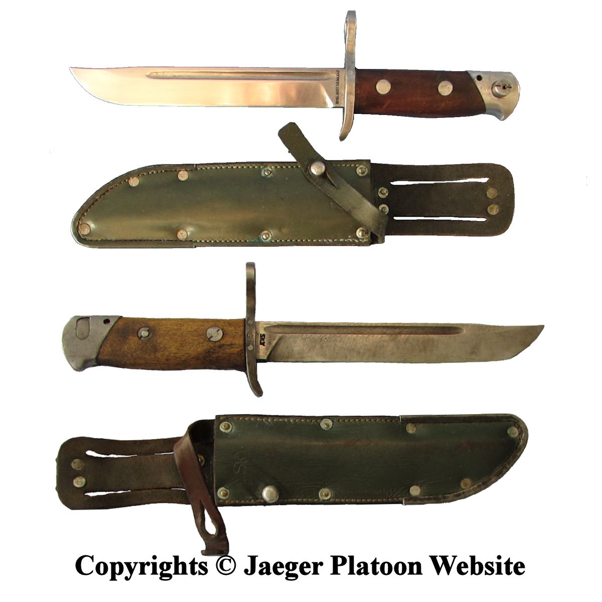 PICTURE: Two knife bayonets m/39 - near mint one (top) and very worn example (below). Metal parts of this bayonet are "on the white" and wooden grip originally dark brown. Steel rivets used to attach wooden grip piece are the type that can be opened with special tool and pommel has the cleaning / oiling hole. Notice leather sheath with steel reinforcement in tip of the sheath. There are several varieties of reproductions of this bayonet floating in the market, so buyer be aware! COPYRIGHTS JAEGER PLATOON WEBSITE. CLICK THUMBNAIL TO SEE LARGER PIC (107 KB).