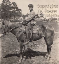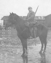 PICTURE: Photograph of Finnish Army cavalry soldier on horseback. This photo is presumably from late 1920's or early 1930's and gives rather good idea about equipment kit issued to Finnish cavalry soldiers at that time. The rifle appears to be cavalry rifle M/91, which was the standard rifle model for cavalry at the time. Notice shortened cavalry sword (French m/1822) hanging in its scabbard from side of the saddle and socket bayonet with leather scabbard hanging from soldiers belt. The soldier is wearing cavalry uniform m/22 with shorter version of fur overcoat m/22 issued by cavalry. (Original photo part of Jaeger Platoon Website photo collection) CLICK THUMBNAIL TO SEE LARGER PIC (120 KB).