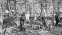 PICTURE: Finnish cavalry soldiers shown scrubbing rust from scabbards of their cavalry swords. The steel