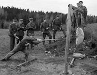 With instruction manuals now available, Army still needed training equipment and practice ranges for teaching of the bayonet fighting. Apparently there were some Russian training equipment for bayonet-fighting among materials captured in year 1918 and in addition some units had built also equipment for their own use, but these were far too small in number to provide training equipment for all military units. The solution proved to be converting 625 Berdan m/1870 rifles to practice rifles for bayonet-training. Weapons and Ammunition Depot 1 (Ase- ja Ampumatarvikevarikko 1) in Helsinki converted the rifles for this purpose and delivered them in August of 1926. This bayonet-fighting practice rifle was equipped with spring-loaded steel bar inserted inside muzzle of their rifle barrel and with piece of padding on tip of the steel bar. Apparently design of this bayonet-fighting practice rifle proved quite successful or at least sufficient, since they remained in active use at least until World War 2 and last of these practice rifles were not scrapped until 1960’s. In addition soldiers also needed protective gear for practicing bayonet fighting - namely fencing masks and padding for certain body parts. These were manufactured and made available for all Army units around 1925 – 1926. In addition practice ranges designed for the purpose were built to Army garrisons and military schools around that time. Typically bayonet-fighting practice ranges were equipped with hanging burlap sacks filled with straws, against which the soldiers practiced use of bayonet. With training gear and training ranges ready, Finnish Army got bayonet-training going on full scale starting circa year 1926. While bayonet-fighting was taught in all Finnish Army until World War 2 and it became part of skill set trained to infantry soldier, unlike in some countries it remained just a military skill, instead of developing to a sport (bayonet-fencing). This was the situation when Finland entered World War 2 with Winter War.