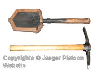 PICTURE: World War 2 era Finnish Army entreching tool and pickaxe. Notice entreching tool belt carrier routinely issued with entreching tools, they were mostly replaced with belt loops in year 1941. Pickaxe was issued with its own special belt carrier also made from leather. COPYRIGHTS JAEGER PLATOON WEBSITE. CLICK THUMBNAIL TO SEE LARGER PIC (55 KB).