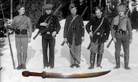 PICTURE: Members of Finnish Red Guards and Russian soldiers photographed in Finland in year 1918. Leader in the middle has what seems to be Russian dragoon shashka sword in hand while Russian sailor next to him has Russian bebout dagger hanging from his belt. Finnish Red Guards member on the leader's other side has Japanese bayonet on his belt. (Black and white photo made available for free use by Museokeskus Vapriikki, photo of similar dagger provided by friendly collector). (Photo source for black-and-white photo Vapriikin Kuva-arkisto / Photo Archive of Museum Centre Vapriikki / Museokeskus Vapriikki, used with CC BY 2.0 license). THUMBNAIL TO SEE LARGER PIC (109 KB).