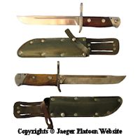 PICTURE: Another two pre World War 2 issued Finnish Army long knife bayonets - bayonet m/29 (top) and bayonet m/35 (below). Bayonets m/27 and m/29 look almost identical - they only have structural differences which are typically difficult to spot. Both of them are "on the white" and rivets used to attach wooden grip panels have "nipples" in middle of them. Scabbards used with bayonets m/27 and m/29 were painted black with coat of lacquer added on top of paint. First fluted scabbard from the top shows early leather frog, which the dark leather frog on the second fluted scabbard being the type usually used with later smooth scabbard issued with bayonet m/35. This sort of dark painted frogs were made in Weapons Depots in 1937 - 1939. All metal parts of bayonet m/35 were blued, which often makes the whole bayonet appear black. The leather frog used in the smooth scabbard in the bottom is standard issue Finnish Army post-war replacement frog made from grey-green leather. COPYRIGHTS JAEGER PLATOON WEBSITE. CLICK THUMBNAIL TO SEE LARGER PIC (95 KB).