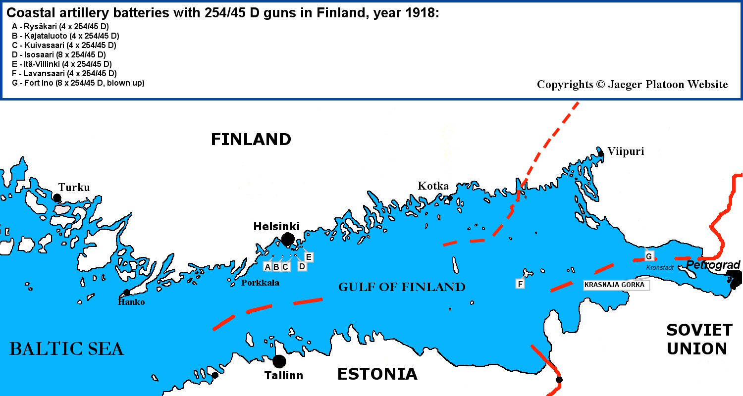 The origin of Finnish coastal artillery is so tightly linked to Russian coastal artillery batteries built by year 1917, that this might be a good place to write few words how Finland come up inheriting such a strong coastal artillery from Imperial Russia. During Russian - Japanese War of 1904 - 1905 Russia lost basically almost whole of its Baltic Fleet, which had been sent to Pacific once the Pacific Fleet had already been lost. This left Russian Navy very weak in Baltic Sea and forced it to take defensive role until the lost ships could be replaced, which was expected to take quite a long time. At that time St. Petersburg was Russian capital, so defending it against any possible hostile navy was obviously a high priority. Since Russian Navy had basically lost its Baltic Fleet, it was forced to take defensive stand in its plans against threat of much more powerful German Navy. Year 1913 Russia made a decision to build fortified coastal artillery system, which with sea mines would block access to Gulf of Finland from any enemy surface ships, this fortified coastal artillery system was named as Peter the Great's Naval Fortress. It contained multiple parts with large concentration of coastal artillery firepower in narrows in between city of Tallinn and Porkkala Cape and another line of coastal artillery around Kronstadt naval base. Later the plan was extended to include larger areas and create third line of defence in area in between city of Kotka and Kurgalsky Peninsula. Construction works for building the coastal artillery batteries continued until stopped by Russian Revolution in year 1917. Following Civil War in year 1918 Finnish military took over all the installations, which were in Finnish territory. As a result of these events Finland got such powerful coastal artillery that acquiring it by other means would been otherwise completely outside realistic financial capabilities of the new born state burdened by debts taken during the war.
