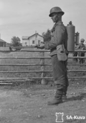 submachine gun hanging on his back. Photographed by Military official P. Jänis. (SA-kuva photo