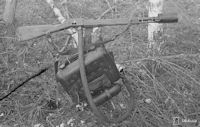 Captured ROKS-3: The Soviets continued development of their ROKS flamethrowers after ROKS-2. The development work produced ROKS-3, which was performance-wise apparently quite similar to ROKS-2, but easier to mass-produce. This flame-thrower has notably simpler fuel container design with single large tubular vertical fuel container and nitrogen tank attached to it also in vertical position. Finnish Army captured small number of ROKS-3 flame-throwers, but it is not known of they ever saw use with Finnish sappers.