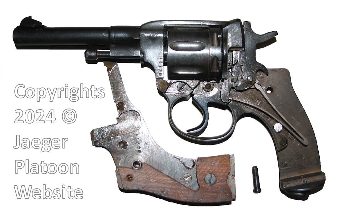 PICTURE: Nagant m/1895 revolver with sideplate removed. Notice (silver-colored) piece of bullet
