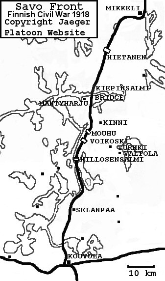 1st: Armed train with 800 Reds in it headed from Kouvola north towards Mikkeli. In Hillosensalmi they faced one of the two railroad-bridges, which the Whites had demolished earlier and started repairing it. The Whites had found out what was coming their way and left with three small armed trains and passenger train to their way. Each of these three armed trains had only one flatcar with cover made from sandbags and locomotive pushing it. The Reds had just successfully repaired the bridge when the Whites arrived with their armed trains arrived and opened fire. The battle continued until the only machinegun that the Whites had with them jammed. As the Reds now had clear advantage in firepower the Whites decided to retreat - their main force returned all the way to Mikkeli. The Reds continued their advance by rail taking over train stations of Voikoski and Mouhu before stopping to wait for their reinforcements and to make preparations for continuing their attack towards Mikkeli.