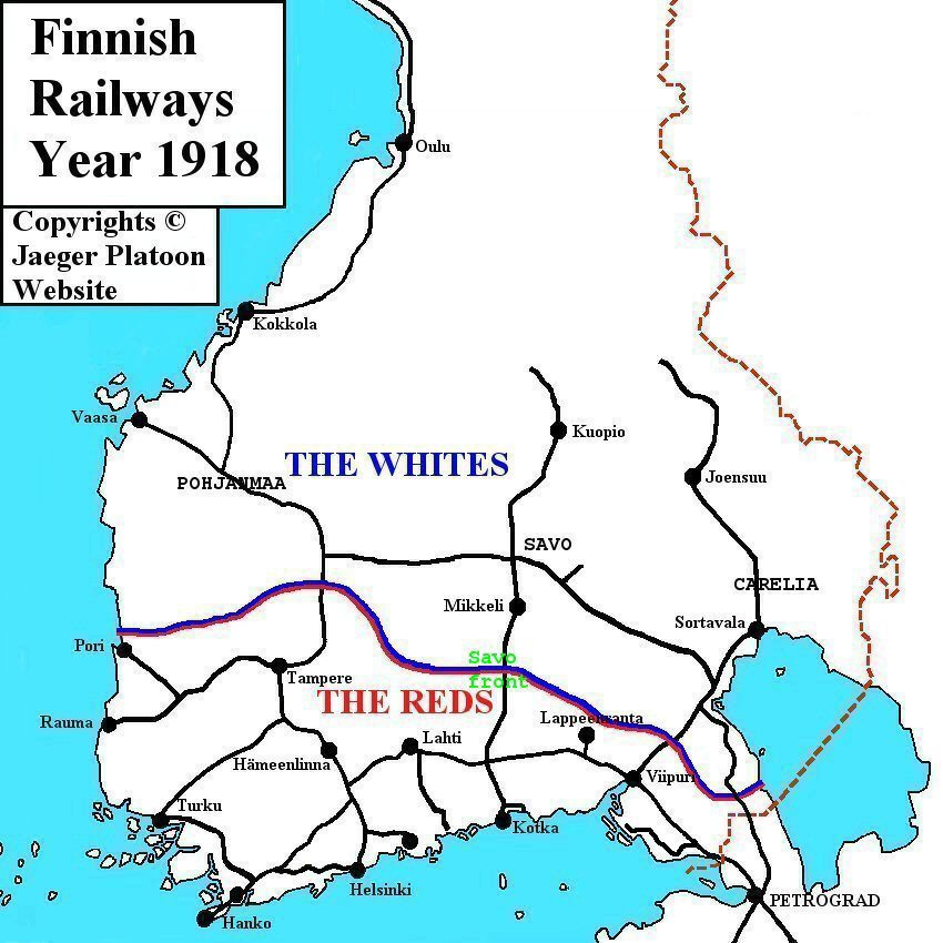 Even if the Whites were quite numerous and relatively well armed in direction of Pohjanmaa railway along the Savo railway the situation started much more difficult. Pretty much all weaponry that they had received from Germany before the war had been distributed to Pohjanmaa region and while the Suojeluskunta of Karelia were able to buy weapons in Viipuri and Petrograd the Suojeluskunta of Savo had neither source of weaponry. So acquiring the necessary weaponry for even the first moves was difficult. While disarming of Russian soldiers started in this area earlier than in Pohjanmaa region, Russian soldiers in small units that were disarmed were so few in number, so even disarming them didn't offer much of an improvement in weaponry-situation. The Reds had achieved popularity in this region mostly in the cities. These cities included especially the heavily industrialised Varkaus in middle of area supporting Whites, the city of Kuopio in the north and city of Kotka with its large harbour in southern end of the railway-line were their main areas of support. Red Guard in city of Mikkeli had rifles, but very little ammunition so it surrendered without a fight. The Red Guards in Kuopio and Varkaus on the other hand were not willing to give up that easily - White Army captured Kuopio only after battle and taking Varkaus demanded both battles and a siege.